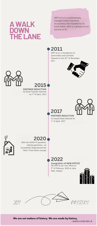 During the COVID-19 pandemic in 2020, SKPT & Co. demonstrated operational resilience by successfully transitioning to a technology-enabled work-from-home model, ensuring continuity of client services during unprecedented times. In February 2022, the firm reached another significant milestone by shifting to its new office premises at Jana Path, Ulubari, reflecting its steady growth and expanding professional footprint. Today, SKPT & Co. continues to build on its foundation of Experience, Expertise, and Excellence, serving clients with a commitment to quality, professionalism, and long-term value creation.
